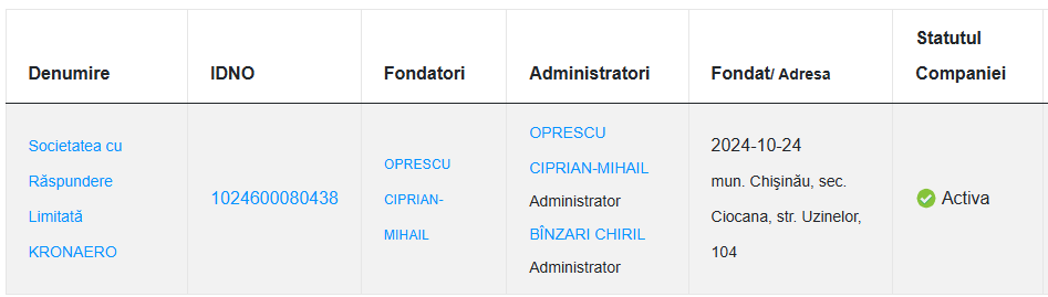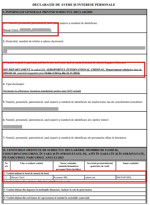La Chișinău, Kronaero este gestionată de Chiril Bînzari, numit în funcție pe 27 ianuarie 2025. Acesta ocupa simultan și o funcție de conducere în cadrul Aeroportului Internațional Chișinău, respectiv șef al Departamentului Tehnic. Ulterior, s-a eliberat din funcția de la AIC, însă nu înainte de a încasa de la Kronaero SRL un salariu în valoare de 80 670 de lei. Potrivit informațiilor publicate de ANI, Bînzari a demisionat din funcția publică în perioada 4 martie – 4 aprilie 2025, în interiorul termenului de 30 de zile pentru depunerea declarației de avere și interese personale.