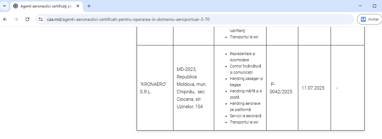 Pe 11 iulie 2025, la doar câteva luni după numirea lui Chiril Bînzari și lansarea campaniei de recrutare, Autoritatea Aeronautică Civilă (AAC) în persoana lui Vasile Șaramet, i-a eliberat companiei certificatul de autorizare P-0042/2025, Kronaero fiind astfel inclusă în lista oficială a operatorilor certificați pentru servicii de handling. AAC este condusă de Vasile Șarament, fost membru PLDM și considerat un apropiat al lui Andrei Spînu, fost ministru al Infrastructurii.