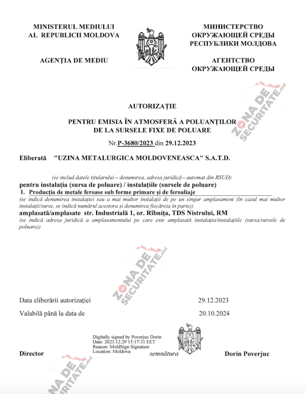 Uzina metalurgică moldovenească din Râbnița (MMZ), gestionată de regimul separatist de la Tiraspol, a primit autorizații de mediu de la Agenția de Mediu a Republicii Moldova.