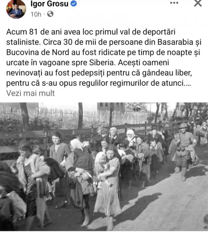 „Acum 81 de ani avea loc primul val de deportări staliniste. Circa 30 de mii de persoane din Basarabia și Bucovina de Nord au fost ridicate pe timp de noapte și urcate în vagoane spre Siberia. Acești oameni nevinovați au fost pedepsiți pentru că gândeau liber, pentru că s-au opus regulilor regimurilor de atunci”, a scris Igor Grosu și a atașat și o poză.