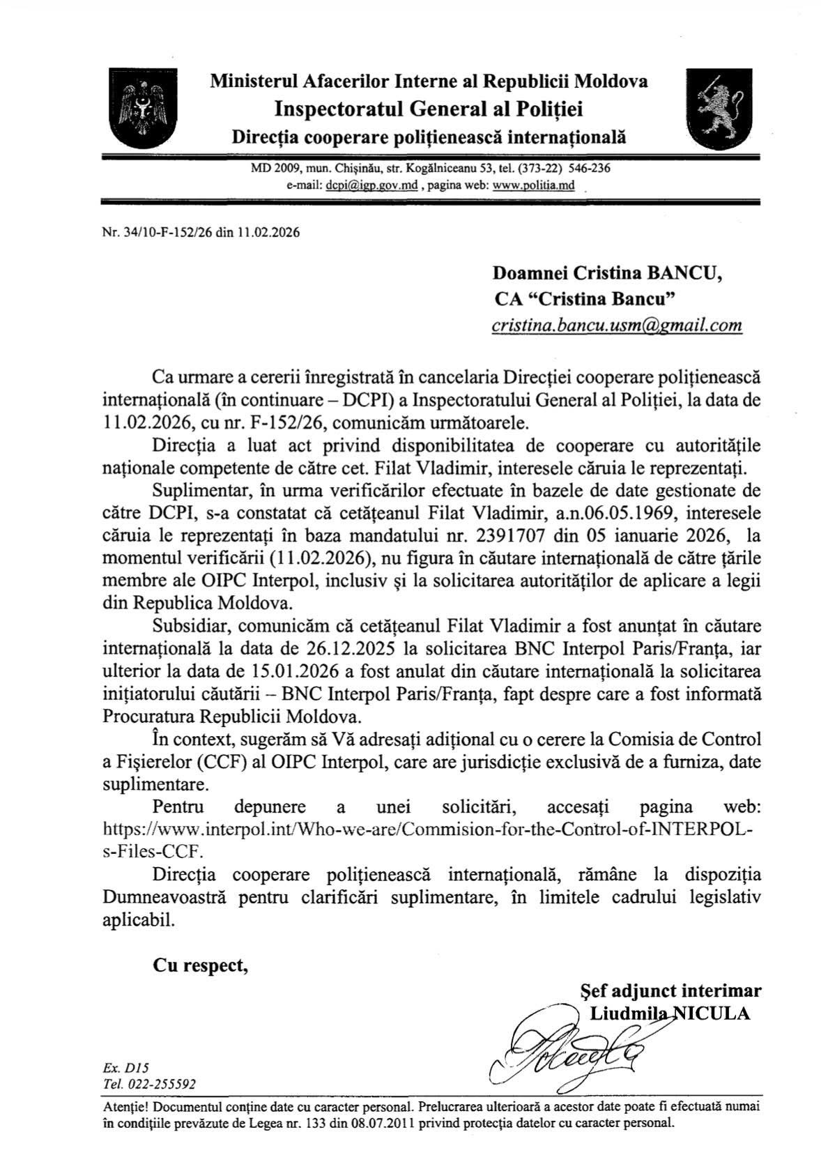 „Informez opinia publică că, la data de 15 ianuarie 2026, Interpol a anulat darea în căutare internațională emisă anterior pe numele meu. Decizia a fost luată la solicitarea instituției care a cerut aplicarea notificării respective”, a scris Filat într-o postare publică.
