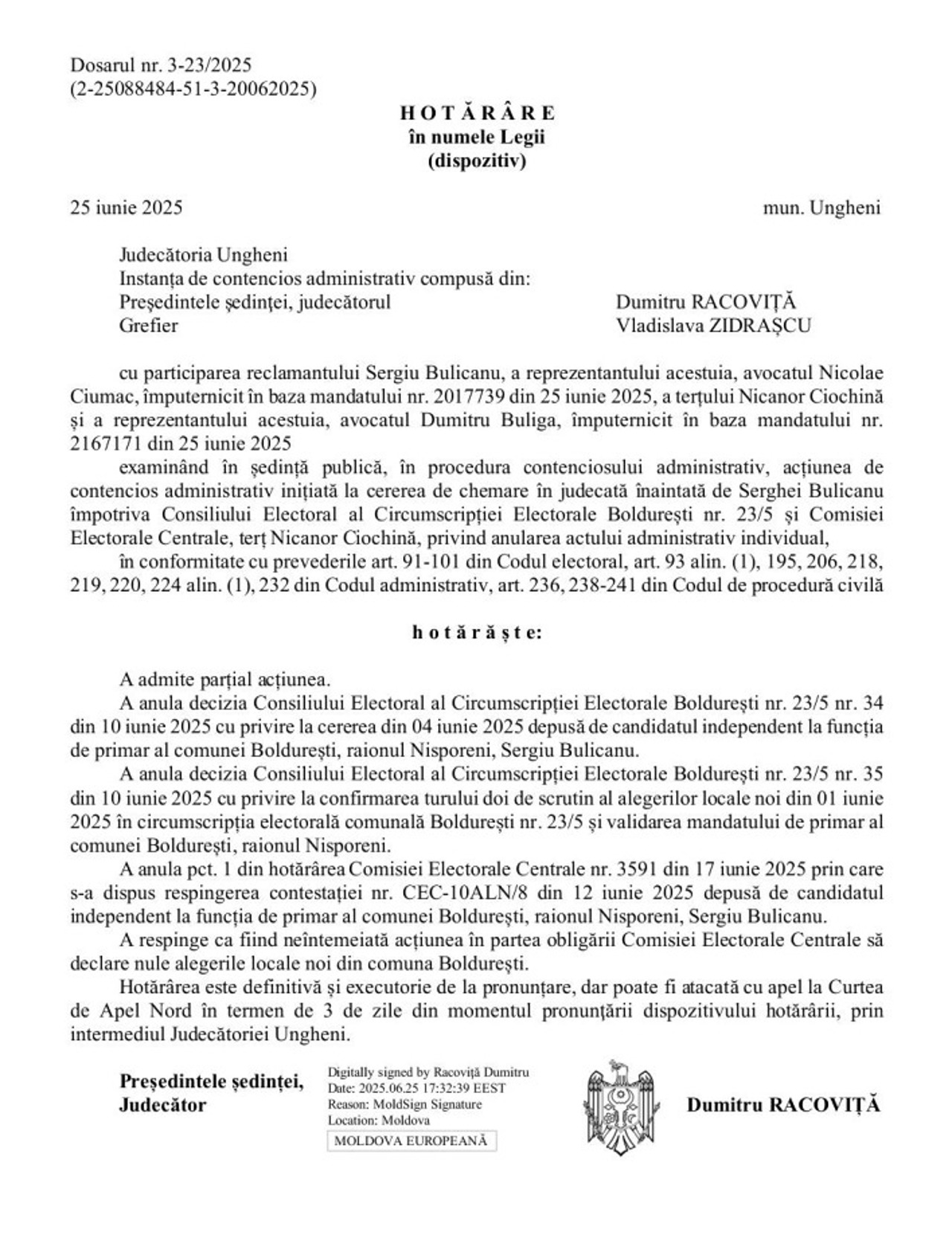 Judecătoria Ungheni a anulat hotărârea Comisiei Electorale Boldurești cu privire la confirmarea turului II de scrutin al alegerilor locale noi din 1 iunie 2025 și validarea mandatului de primar al comunei Boldurești, raionul Nisporeni, al lui Nicanor Ciochină.