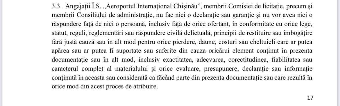 Cel mai scandalos este însă noul punctul, care prevede exonerarea de responsabilitate. Pe lângă faptul că este formulat extrem de vag, acesta conține o înșiruire nemaivăzută de situații în care cei care desfășoară licitația practic nu poartă nicio răspundere. Această prevedere abuzivă a apărut după ce, în procesul de organizare a primei licitații, mai mulți angajați ai aeroportului, inclusiv fostul administrator, au demisionat. Cu puțin timp înainte de lansarea primei licitații a fost demis fostul șef al Agenției Proprietății Publice. Mai mulți juriști și politicieni au remarcat că executanții de la aeroport ai ordinelor guvernării nu vor să răspundă ulterior pentru fraudarea licitației și tocmai de aceea în noul caiet de sarcini a fost introdus punctul care îi scutește de orice răspundere pentru orice acțiune, ceea ce reprezintă o ilegalitate în sine”, se arată în investigația realizată de Telegraph.md.
