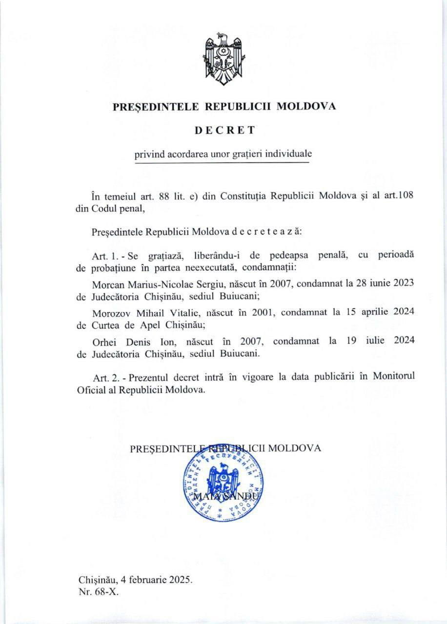 Președinta Maia Sandu a semnat decretul de grațiere pentru Mihail Morozov, condamnat pentru circulația ilegală a drogurilor. Decizia a fost luată în baza unei recomandări a Comisiei pentru grațiere, care a analizat dosarul și comportamentul condamnatului.