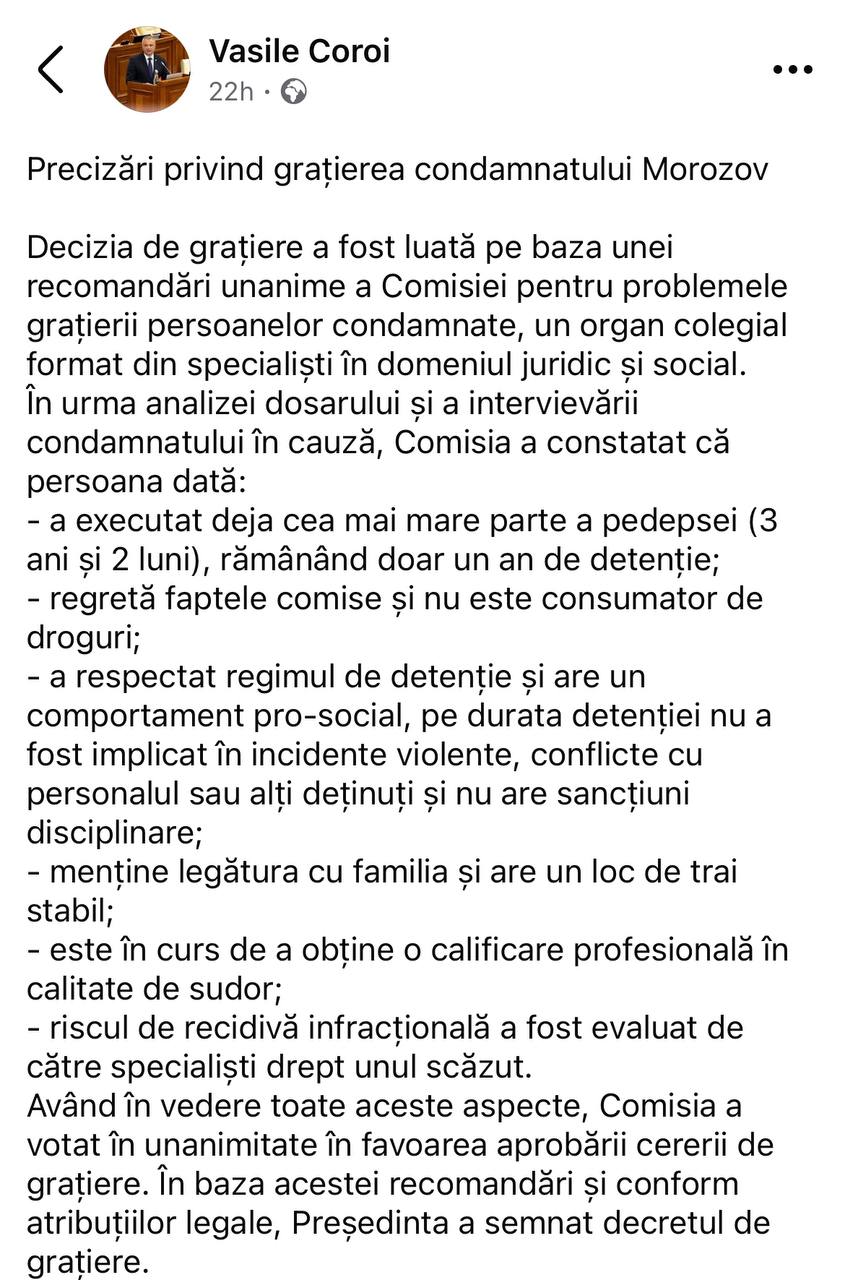 Avocatul Poporului pentru drepturile copilului, Vasile Coroi, a explicat că Morozov și-a recunoscut vinovăția, a executat cea mai mare parte a pedepsei (3 ani și 2 luni), nu are abateri disciplinare în detenție, menține legătura cu familia și urmează un program de reintegrare socială. De asemenea, Comisia a concluzionat că riscul de recidivă este redus.