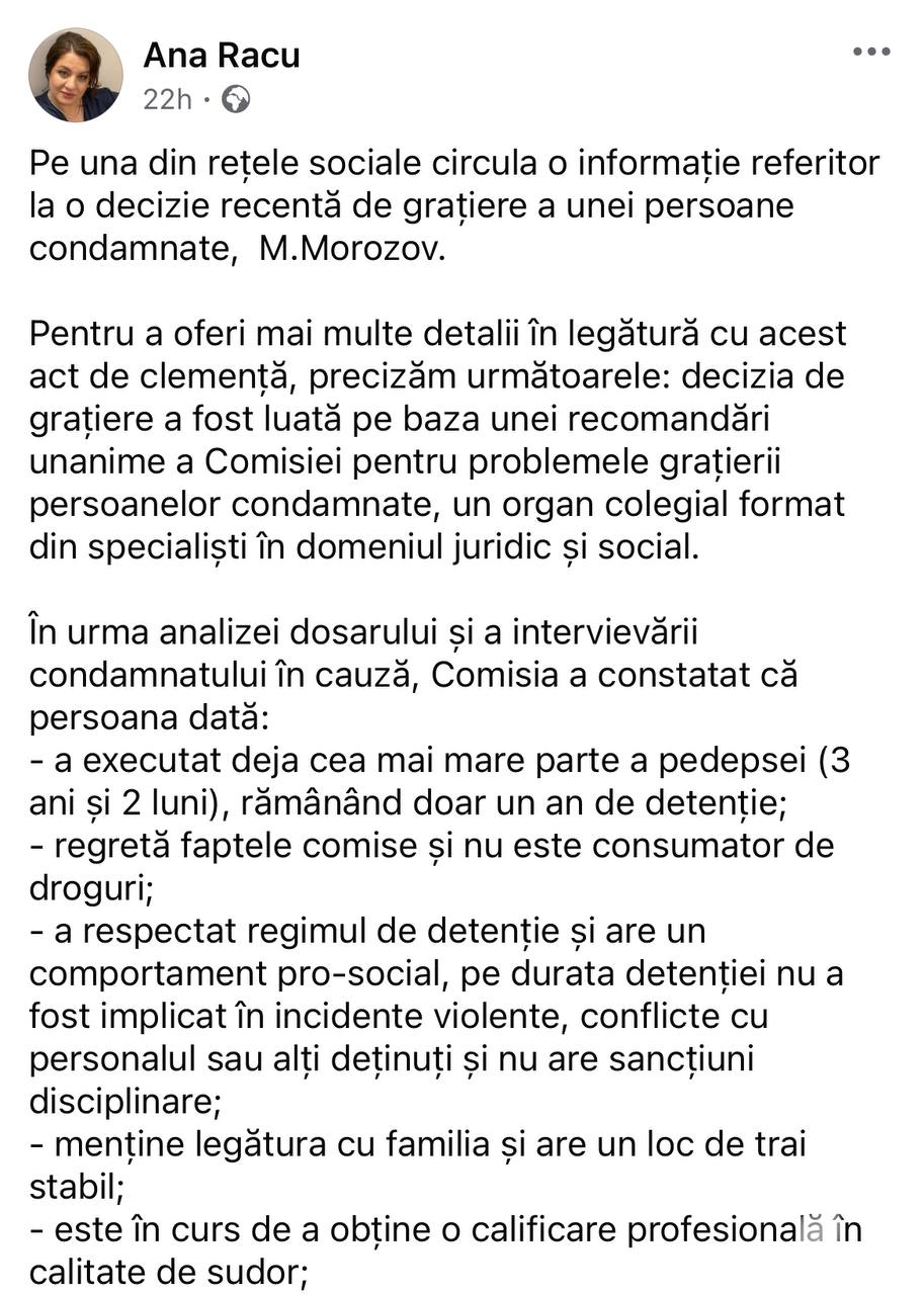 Și deputata PAS Ana Racu a venit cu precizări despre grațierea lui Mihail Morozov, condamnat pentru infracțiuni legate de droguri. Aceasta a subliniat că decizia a fost luată în baza unei recomandări unanime a Comisiei pentru grațiere, un organ consultativ format din specialiști juridici și sociali.
