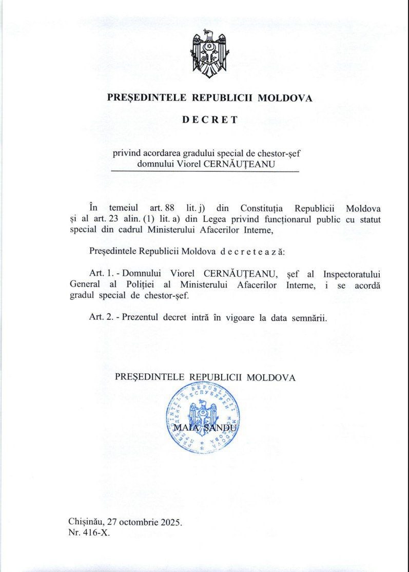 Potrivit documentelor semnate la 27 octombrie 2025, șeful IGP, Viorel Cernăuțeanu, a fost avansat la gradul special de chestor-șef, una dintre cele mai înalte funcții din structura Ministerului Afacerilor Interne.