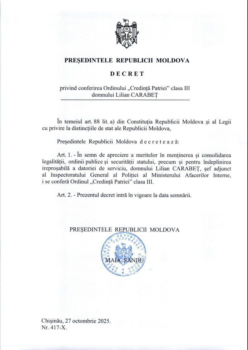 Totodată, printr-un alt decret prezidențial, Lilian Carabet, șef adjunct al IGP, a fost decorat cu Ordinul „Credință Patriei”, clasa III, în semn de recunoaștere pentru contribuția sa la menținerea ordinii publice, asigurarea securității statului și îndeplinirea exemplară a datoriei de serviciu.