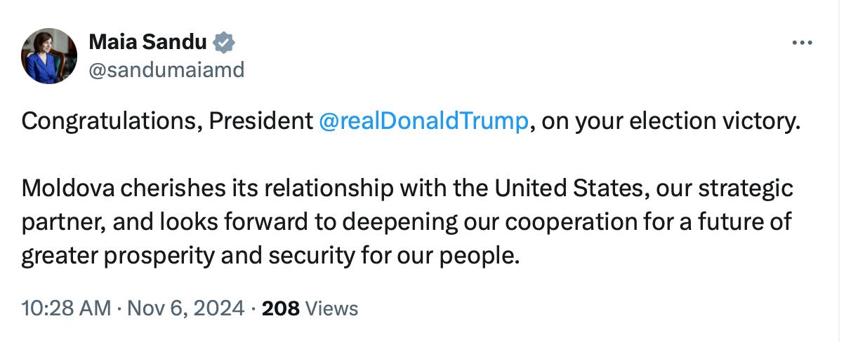 Președinta Maia Sandu l-a felicitat pe Donald Trump cu victoria sa la alegerile din SUA. În mesajul său postat pe rețeaua X, Sandu a declarat că Republica Moldova prețuiește relația sa cu Statele Unite.