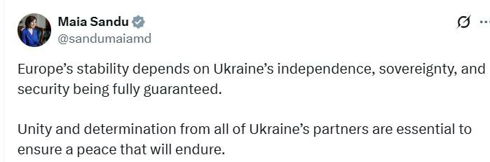 Președinta Republicii Moldova, Maia Sandu, a transmis sâmbătă un mesaj pe platforma X, în contextul intensificării discuțiilor internaționale privind un posibil acord de pace între Ucraina și Rusia. Lidera de la Chișinău a subliniat că „stabilitatea Europei depinde” de asigurarea deplină a independenței, suveranității și securității Ucrainei, punctând că doar „unitatea și determinarea tuturor partenerilor” pot garanta un acord de pace durabil.