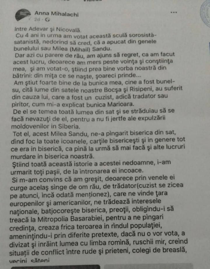 „Cu 4 ani în urmă am votat această sculă sorosistă-satanistă, nedorind să cred, că a apucat din genele bunelului său Milea (Mihail) Sandu. Dar azi, cu părere de rău, am ajuns să regret, ca am făcut acest lucru, deoarece am mers peste voința și conștiința mea, și am votat-o, știind prea bine vorba noastră din bătrâni: „din mâță ce se naște, șoareci prinde”. Am știut foarte bine de la bunica mea, cine a fost bunelul său, câtă lume din satele noastre Bocșa și Risipeni, au suferit din cauza lui, care a fost un cuzist, adică trădător sau pârâtor, cum mi-a explicat bunica Marioara”, a scris Anna Mihalachi.