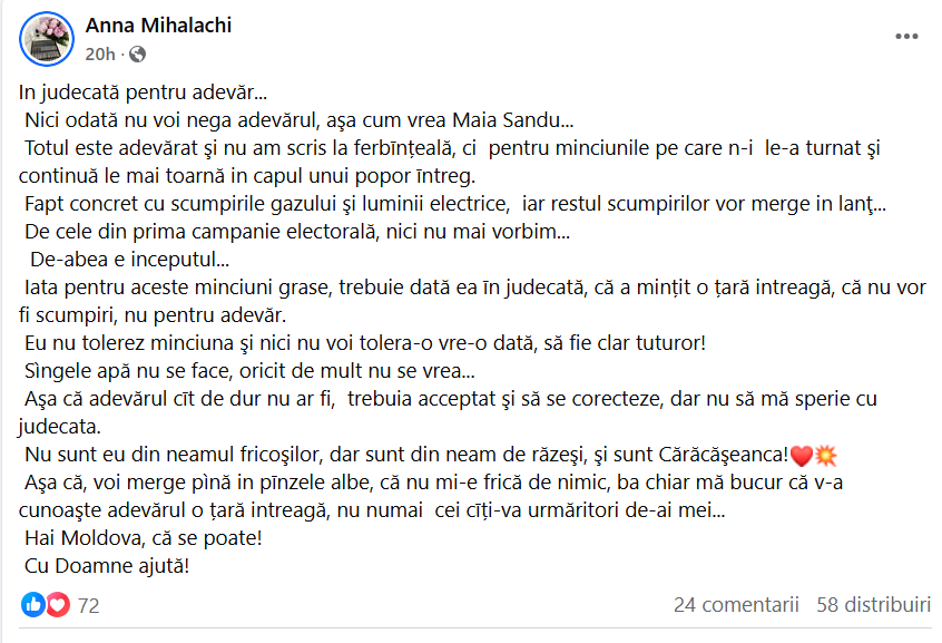„În judecată pentru adevăr… Niciodată nu voi nega adevărul, aşa cum vrea Maia Sandu… Totul este adevărat şi nu am scris la ferbințeală, ci pentru minciunile pe care ni le-a turnat şi continuă le mai toarnă în capul unui popor întreg. Fapt concret cu scumpirile gazului şi luminii electrice, iar restul scumpirilor vor merge în lanţ… De cele din prima campanie electorală, nici nu mai vorbim… De-abia e începutul… Iată pentru aceste minciuni grase, trebuie dată ea în judecată, că a mințit o țară întreagă, că nu vor fi scumpiri, nu pentru adevăr. Eu nu tolerez minciuna şi nici nu voi tolera-o vreodată, să fie clar tuturor!