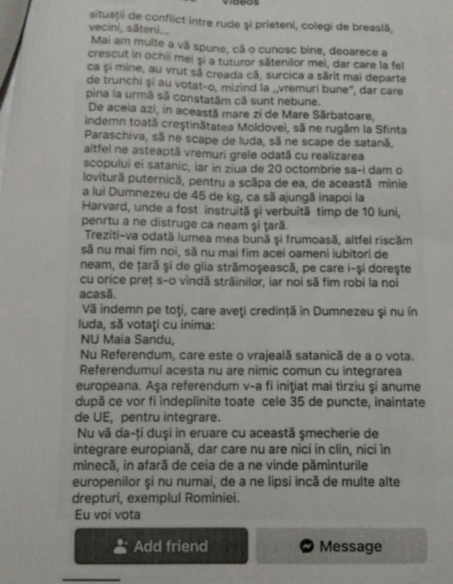 În spațiul online circulă o postare făcută de Anna Mihalachi, în trecut votantă a Maiei Sandu. Femeia îl acuză pe bunelul actualei președinte că ar fi fost informator la vremea lui, iar multă lume din satele Bocșa și Risipeni ar fi suferit din cauza lui.