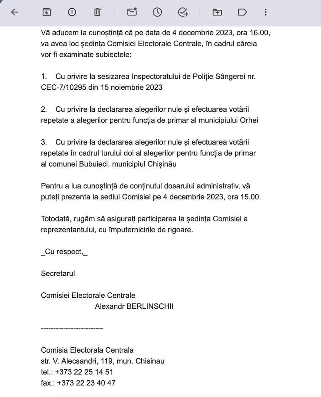 „Asistăm la unele lucruri foarte stranii și periculoase. Se pune la cale o mare ilegalitate. Se încearcă a fi declarate nule alegerile primarului municipiului Orhei. Așa un mesaj am primit în poștă cu privire la agenda de azi a Comisiei Electorale Centrale, chiar dacă pe pagina oficială este o altă agendă”, menționează politicianul.