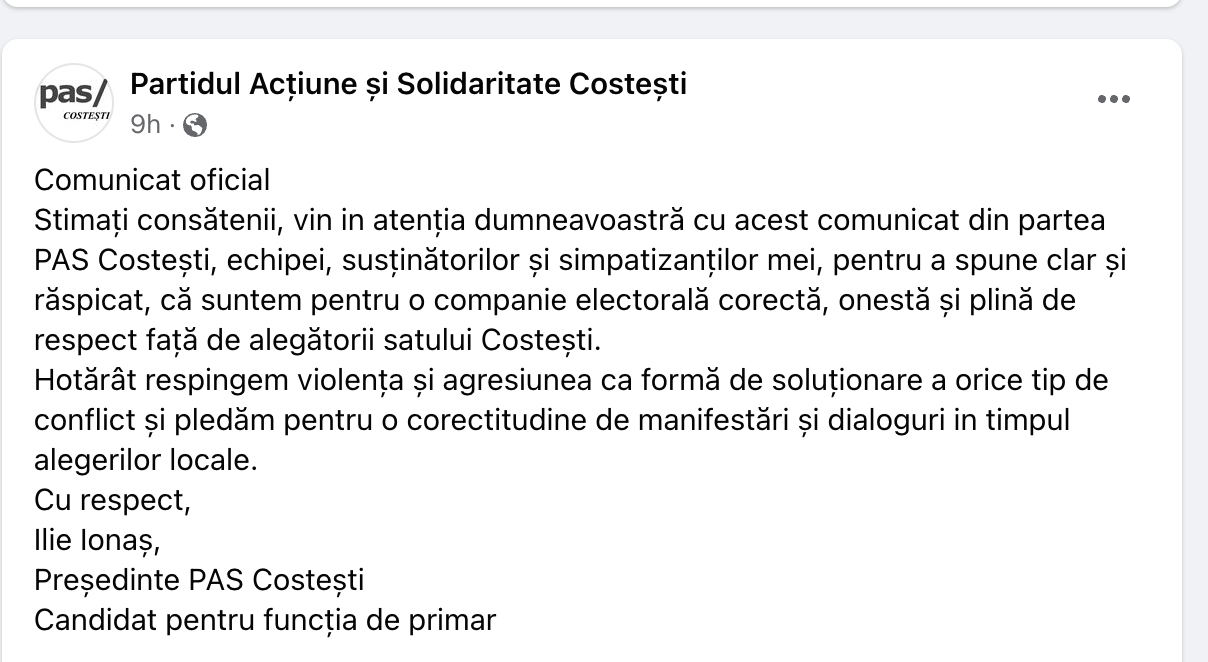 Pe o rețea de socializare, Partidul Acțiune și Solidaritate Costești a emis un comunicat oficial prin care se menționează: „respingem violența și agresiunea ca formă de soluționare a orice tip de conflict și pledăm pentru o corectitudine de manifestări și dialoguri in timpul alegerilor locale”.