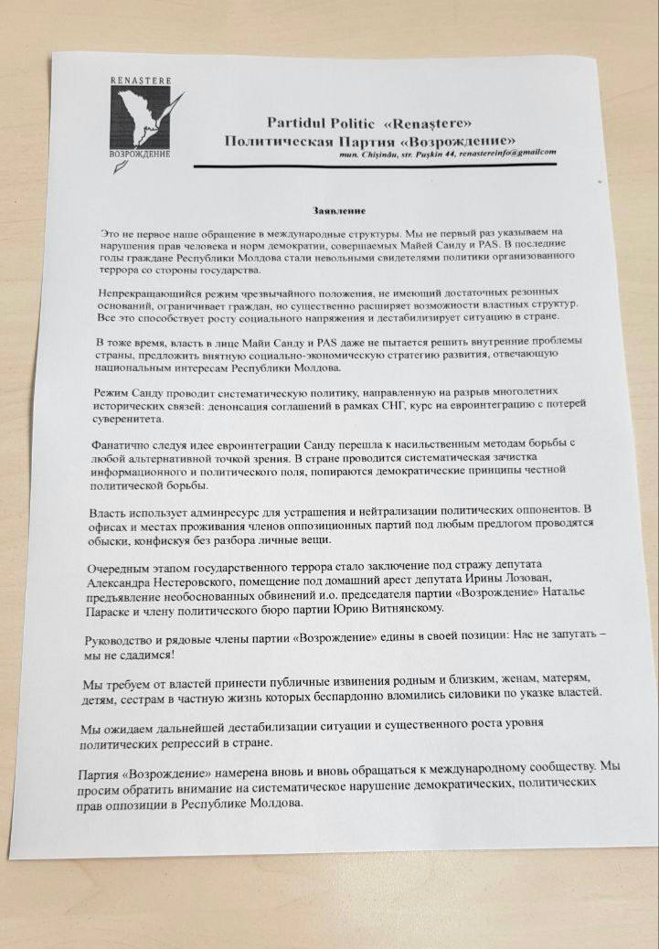 Birourile și casele membrilor partidelor de opoziție sunt percheziționate sub orice pretext, iar bunurile personale sunt confiscate fără excepții. Partidul „RENAȘTERE” intenționează să facă apeluri repetate la comunitatea internațională. Cerem să se atragă atenție la încălcarea sistematică a drepturilor civile și politice ale cetățenilor și la intimidarea opoziției din Republica Moldova”, se mai arată în declarație.