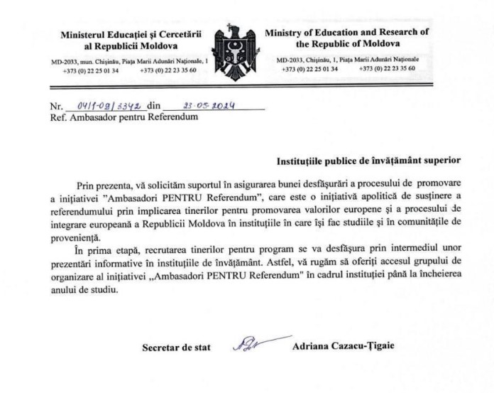 „Vă solicităm suportul în asigurarea bunei desfășurări a procesului de promovare a inițiativei „Ambasadori PENTRU Referendum”, care este o inițiativă apolitică de susținere a referendumului prin implicarea tinerilor pentru promovarea valorilor europene şi a procesului de integrare europeană a Republicii Moldova în instituțiile în care își fac studiile și în comunitățile de proveniență. În prima etapă, recrutarea tinerilor pentru program se va desfăşura prin intermediul unor prezentări informative in instituțiile de învățământ. Astfel, vă rugăm să oferiți accesul grupului de organizare al inițiativei „Ambasadori PENTRU Referendum” în cadrul instituției până la încheierea anului de studiu”, se arată în scrisoarea transmisă universităților.