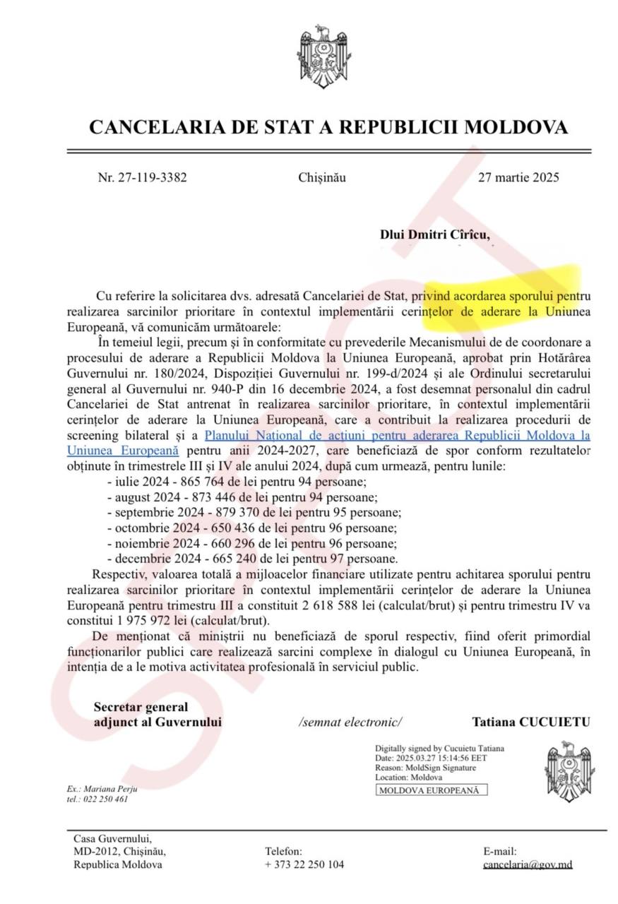 În a doua jumătate a anului 2024, Cancelaria de Stat a cheltuit peste 4,5 milioane de lei din bugetul public pentru acordarea unor sporuri salariale destinate funcționarilor implicați în procesul de aderare a Republicii Moldova la Uniunea Europeană. Informația a fost publicată de canalul de Telegram SPPOT, în baza unui răspuns oficial semnat de Tatiana Cucuietu, secretar general adjunct al Guvernului.