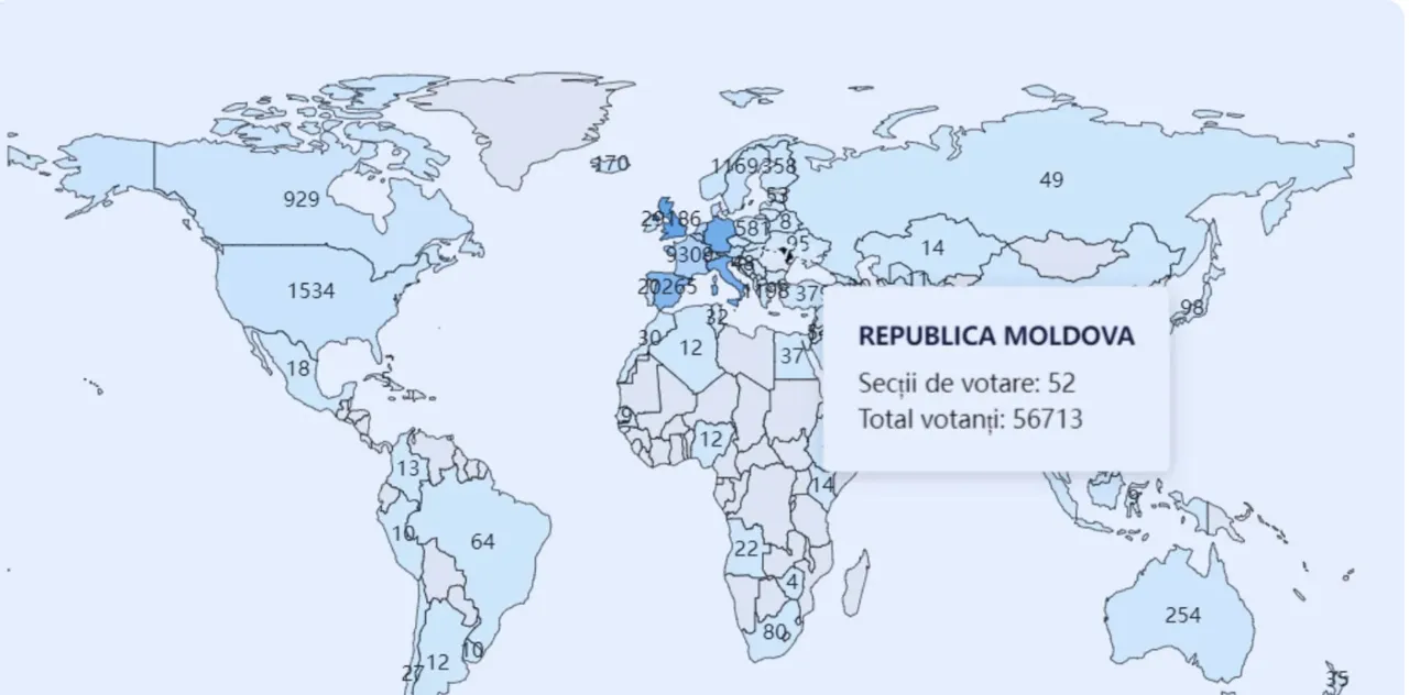 Numărul total de voturi, la închiderea secțiilor, a fost 56.713, potrivit Autorității Electorale Permanente din România. Pentru alegerile în Parlamentul European, în R. Moldova au fost deschise 52 de secții de votare.