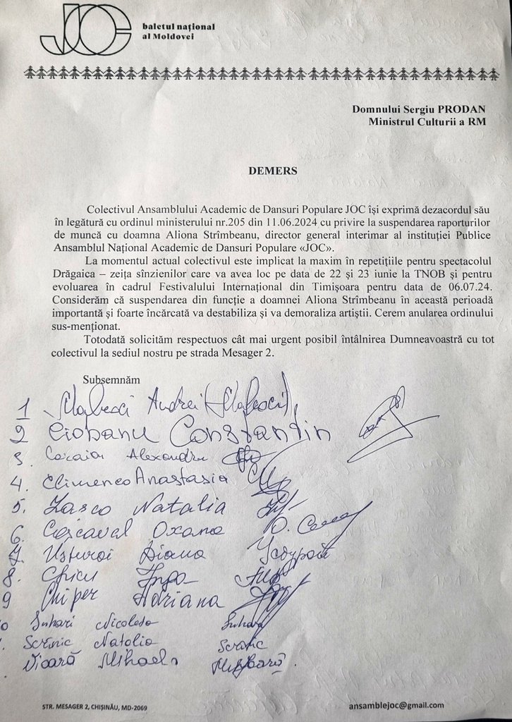 Pe pagina oficială de Facebook a ansamblului național „Joc” a fost publicat un demers adresat ministrului Culturii Sergiu Prodan, care este semnat de 68 de persoane, membri ai colectivului, potrivit textului.