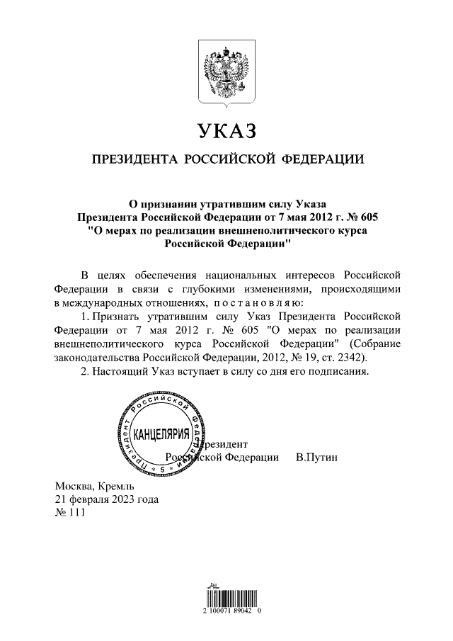 Decretul care a fost semnat de Putin în 2012 stipula care sunt relațiile și politicile Kremlinului în raport cu Uniunea Europeană, SUA, țări din Africa, Belarus sau cu regiunile separatiste ale Georgiei. Documentul conținea și poziția Rusiei cu privire la reglementarea conflictului transnistrean din Republica Moldova. Odată cu întreg decretul, Putin a anulat și prevederea care stipula că Rusia „va continua să se implice activ în căutarea modalităților de soluționare a problemei transnistrene bazate pe respectarea suveranității, integrității teritoriale și a statutului neutru al R. Moldova, cu stabilirea unui statut special pentru Transnistria”.