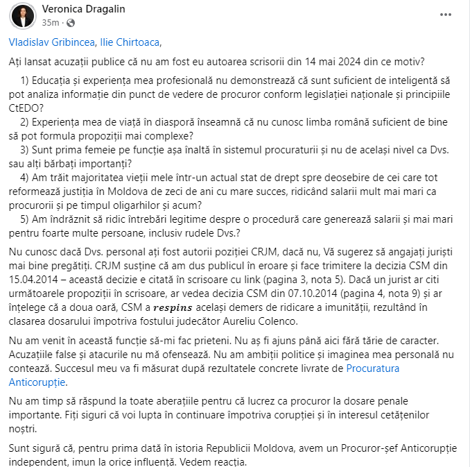 Sunt prima femeie pe funcție așa înaltă în sistemul procuraturii și nu de același nivel ca Dvs. sau alți bărbați importanți?“, a scris Dragalin.