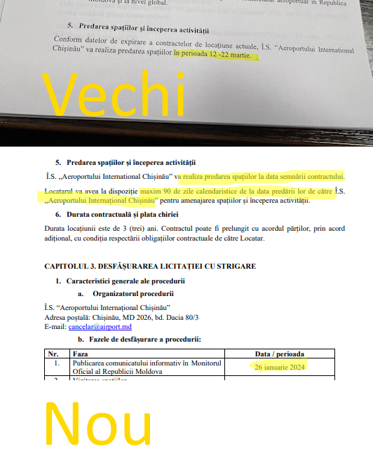În timp ce în caietul de sarcini de pe site-ul APP, la capitolul fazele de desfășurare a procedurii de concesionare se menționează că predarea spațiilor comerciale se va realiza pe parcursul a șapte zile după achitarea chiriei și este indicată perioada 12-22 martie 2024, în cel modificat este scris că predarea se va face în ziua semnării contractului. O altă schimbare ține de cuantumul inițial al chiriei lunare. Aceasta a crescut de la 157 de mii de euro, la aproape 158,5 mii de euro. Respectiv, a crescut și acontul de participare în mărime de 10 la sută – de la 15.700 de euro la 15.849 de euro. De asemenea, a apărut precizarea că plata se va efectua în moneda națională, la cursul BNM din acea zi.