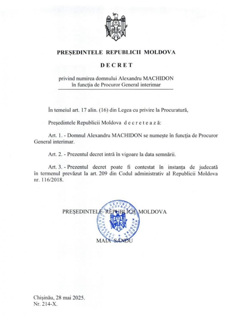 Președinta Republicii Moldova, Maia Sandu, a semnat decretul prin care Alexandru Machidon este numit în funcția de Procuror General interimar. Candidatura sa a fost propusă de Consiliul Superior al Procurorilor, în urma ședinței din 28 mai curent. Astăzi, șefa statului l-a prezentat pe noul Procuror General interimar echipei Procuraturii.