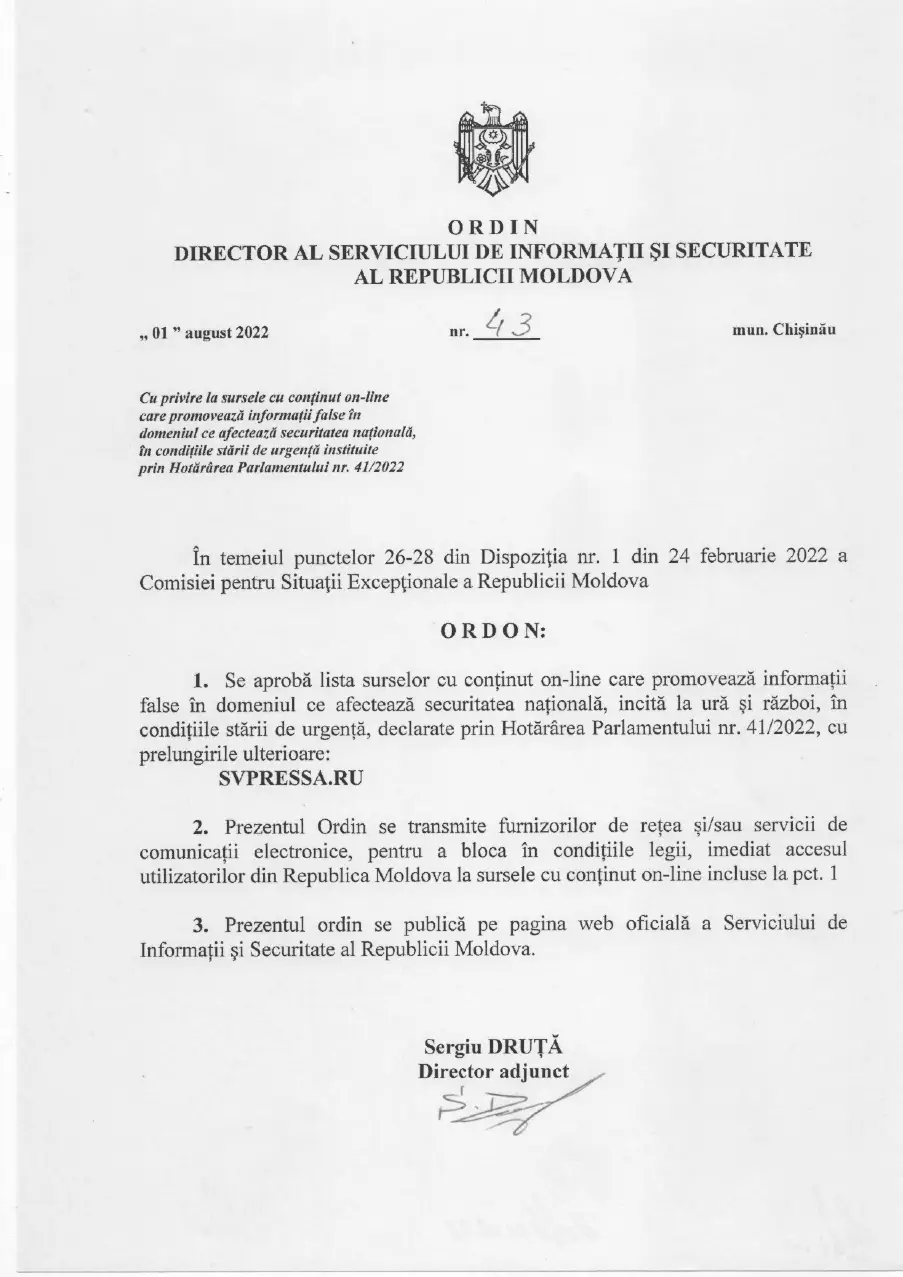 Astfel, prin ordinul directorului SIS a fost solicitată blocarea site-ului web menționat ca sursă care promovează informații false ce incită la ură și război, în condițiile stării de urgență.