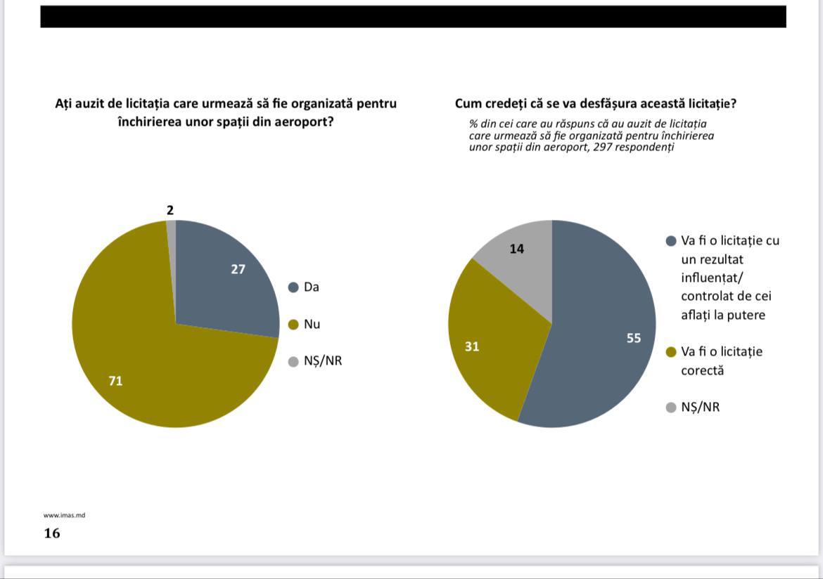 „Pe măsură ce autoritățile încearcă să credibilizeze tot felul de licitații care au loc legat de aeroport percepțiile populației merg în direcție opusă. Și marea majoritate, peste 80 la sută, consideră că aeroportul trebuie să rămână în proprietatea statului. O notorietate destul de scăzută a celor care aud despre scandalurile în privința închirierii unor spații de la aeroport. Doar 27 la sută au auzit de asta. Dar cei care auzit, 55 la sută, consideră că aceste licitații vor aduce un rezultat controlat în interesul celor aflați la putere”, a declarat directorul general la IMAS Chișinău, Doru Petruți.