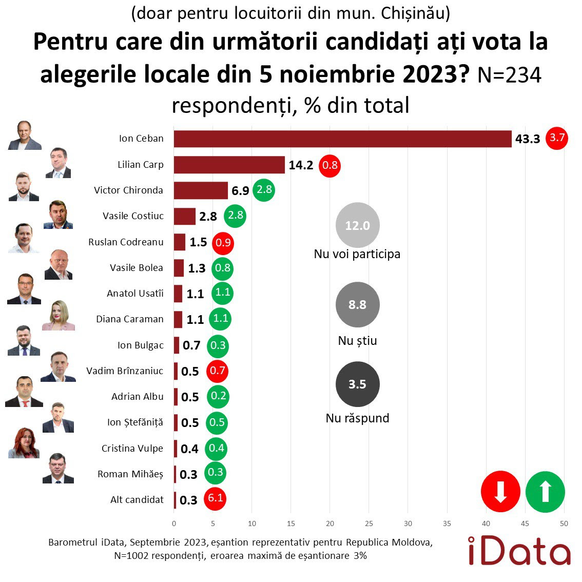 Actualul primar al Chișinăului, Ion Ceban, este favoritul alegerilor locale din acest an. Un sondaj iData arată că 43,3% din respondenții din municipiu sunt hotărâți să îl voteze la scrutinul din 5 noiembrie. Dacă se iau în calcul doar răspunsurile respondenților deciși, Ion Ceban ar câștiga alegerile cu 57,6% din voturi.