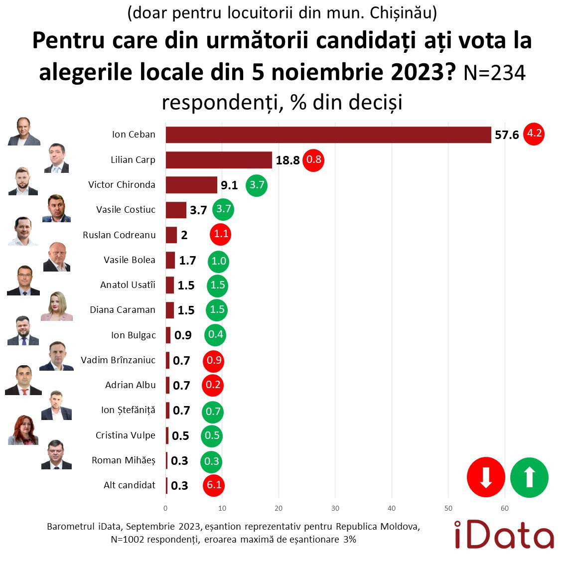 Conform răspunsurilor respondenților deciși, după liderul Ion Ceban, care ar câștiga alegerile cu 57,6% voturi, urmează Lilian Carp, pentru care și-ar da votul 18,8% din alegatori, iar pentru Victor Chironda ar vota 9,1% alegatori. Vasile Costiuc ar primi 3,7% voturi. Alți candidați ar acumula 2% și mai puțin.