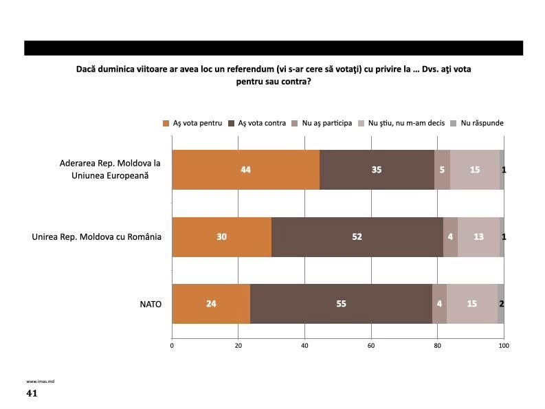 Dacă duminica viitoare ar avea loc un referendum privind aderarea Republicii Moldova la Uniunea Europeană, 44% ar vota „pentru”, iar 35% „contra”. 5% spun că nu ar participa, 15% sunt indeciși, iar 1% nu au răspuns.