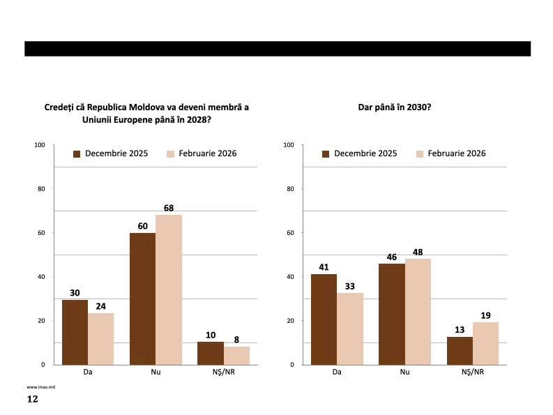 La întrebarea dacă Republica Moldova va deveni membră a Uniunea Europeană până în 2028, doar 24% dintre respondenți (în februarie 2026) cred că acest lucru se va întâmpla, în scădere față de 30% în decembrie 2025. 68% consideră că aderarea nu va avea loc până în 2028 (față de 60% în decembrie), iar 8% nu știu sau nu au răspuns.