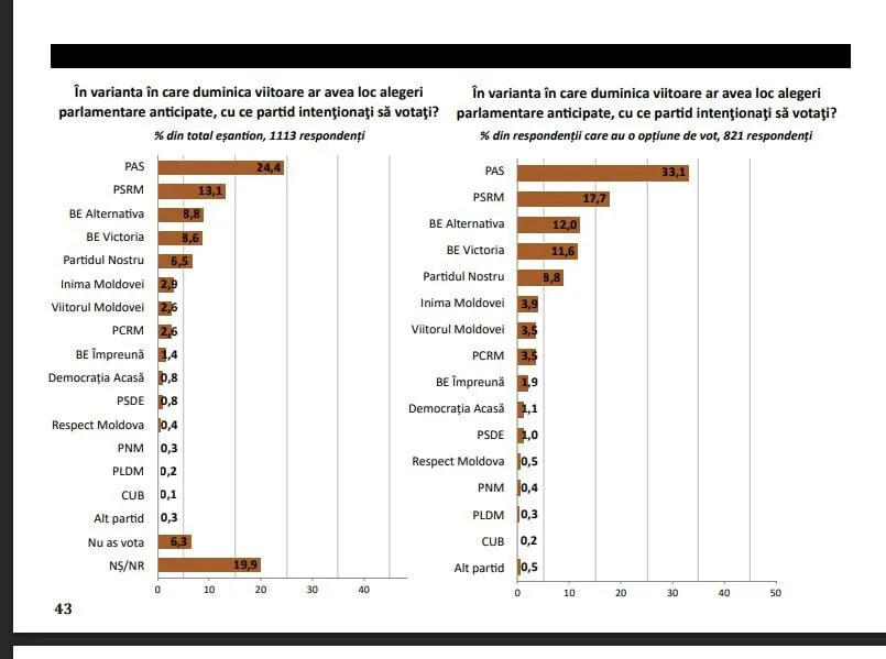 Conform datelor sondajului, Partidul Acțiune și Solidaritate (PAS) se menține în fruntea preferințelor electoratului, cu 33,1% din voturi. Pe locul doi se află Partidul Socialiștilor din Republica Moldova (PSRM), cu 17,7%, urmat de Partidul Nostru, care ar obține 8,8% și ar reuși astfel să treacă pragul electoral de 5% necesar pentru partide.