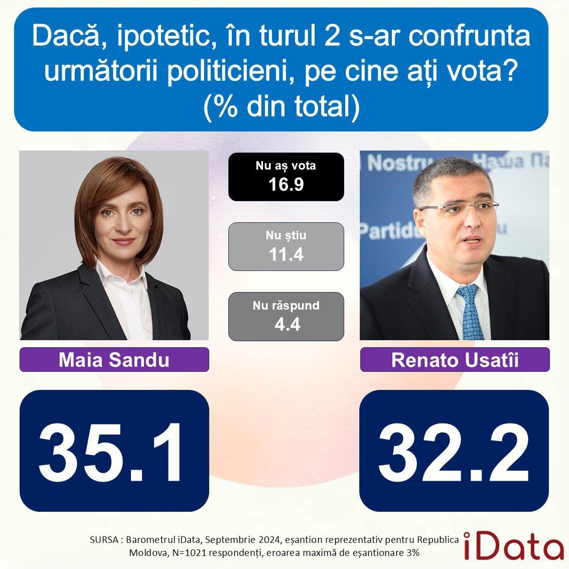 Același sondaj arată că dacă Maia Sandu accede cu Renato Usatîi în turul doi, aceasta va acumula 35,1%, în timp ce Usatîi – 32,2%.