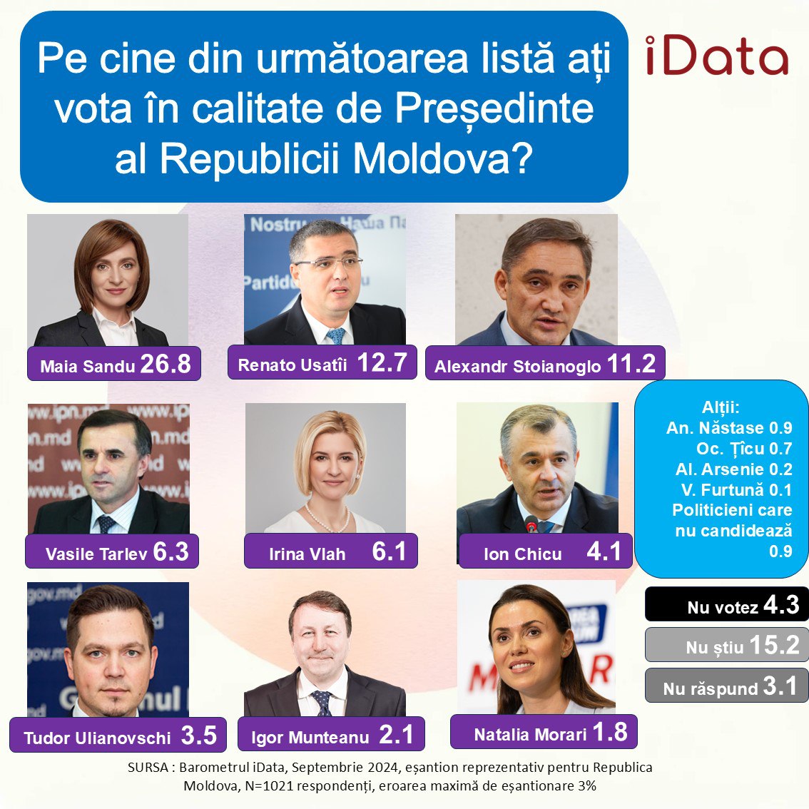 Astfel, potrivit cercetării, Maia Sandu ar acumula 26,8% dintre sufragii, în timp ce Renato Usatîi – 12,7%. La mică distanță de Renato Usatîi se află fostul procuror general, Alexandr Stoianoglo, cu 11,2%.