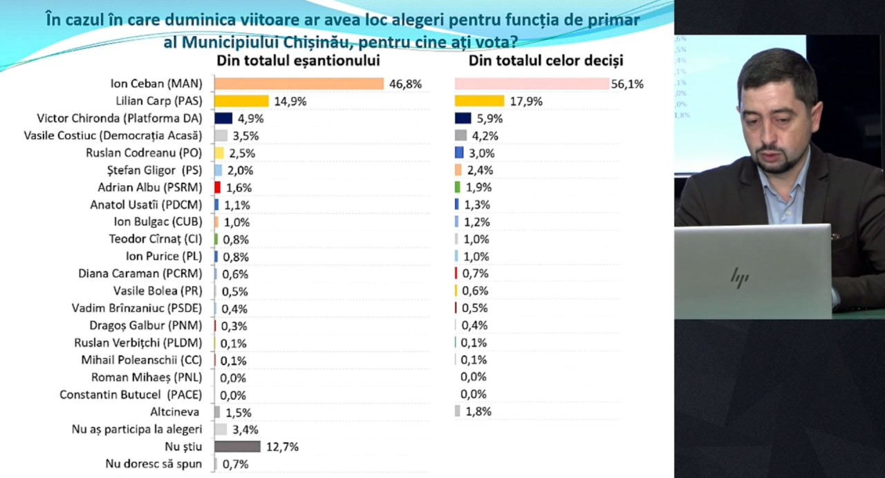 Astfel, pentru Ceban și-ar da voturile peste 56 la sută dintre alegătorii deciși. Acesta este urmat de Lilian Carp cu aproape 18 la sută, urmat de Victor Chironda cu aproape 6 procente.