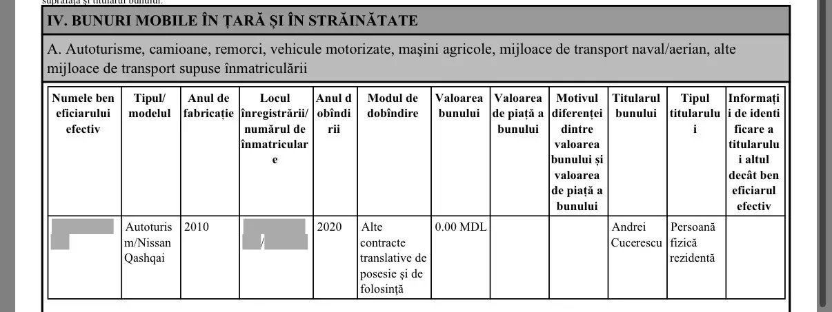 Automobilul de model Nissan Qashqai a fost procurat în 2020, în același an în care familia Cucerescu a procurat și apartamentul familiei Politov-Cangaș, iar toate bunurile au fost transmise imediat spre folosința Anei Cucerescu, judecător.