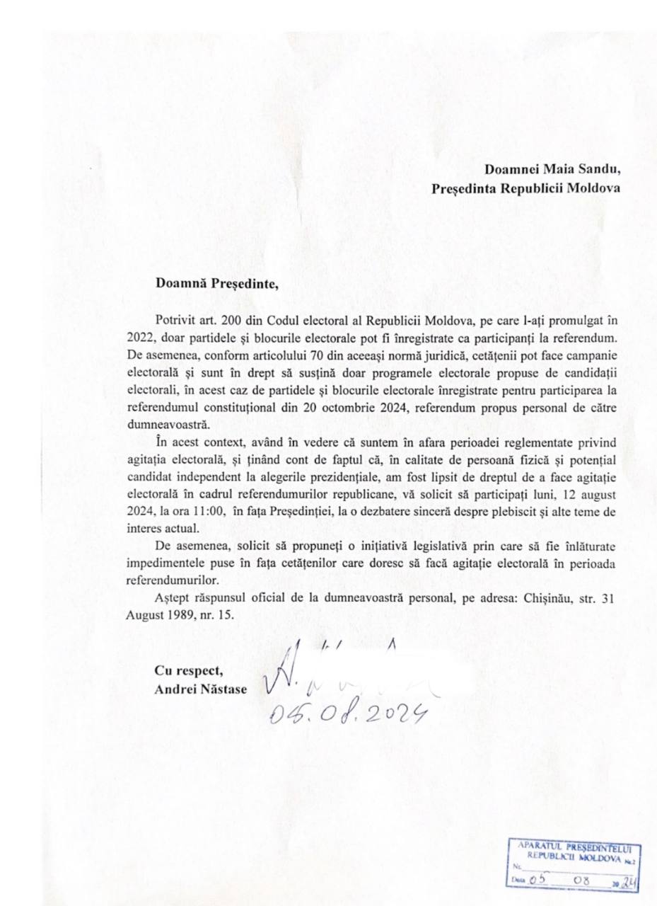 Fostul ministru de Interne, Andrei Năstase o invită pe șefa statului, Maia Sandu la dezbateri pentru că, potrivit lui, „cetățenii au dreptul să știe ce a făcut președintele în ultimii patru ani pentru ei”. În acest sens, politicianul a depus și un demers oficial la Președinție, prin care anunță că o va aștepta pe președintă pe scările Președinției, la ora 11.00.