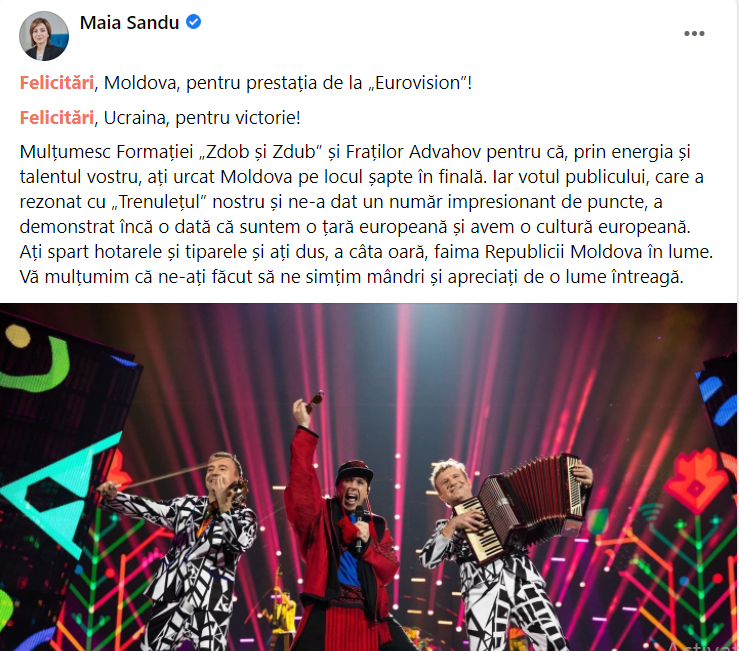 „În mesajul de felicitare, Maia Sandu ne spune astfel – Votul publicului, care a rezonat cu „Trenulețul” nostru și ne-a dat un număr impresionant de puncte, a demonstrat încă o dată că suntem o țară europeană și avem o cultură europeană. Doamna președinte, de ce distorsionați mesajul piesei? Prestația bună de la Eurovision se datorează mesajului pro-românesc, care a răsunat în întreaga Europă și nicidecum faptului că „avem o cultură europeană”. Constatăm iarăși o ignorare pe față a valorilor românești și a tot ce înseamnă românesc. Or, și în acest an, președintele Maia Sandu, la data de 6 mai, „a uitat” de Podul de Flori din 1990, însă a ținut morțiș să felicite găgăuzii cu sărbătoarea locală – Hederlez”, a declarat Vlad Bilețchi.