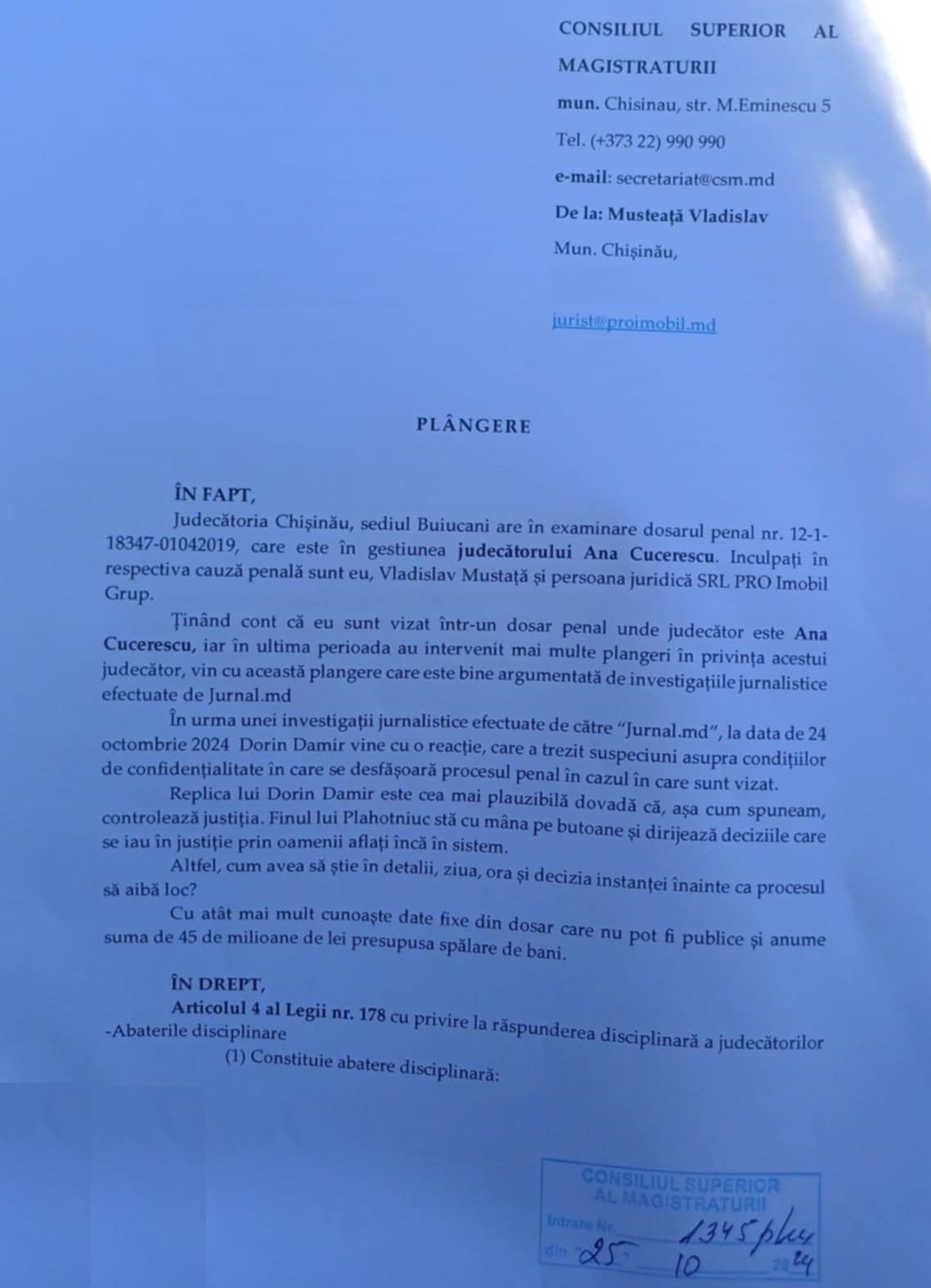 Vlad Musteață, fondatorul companiei Proimobil, solicită Consiliului Superior al Magistraturii să o sancționeze pe judecătoarea Ana Cucerescu, care are în gestiune dosarul penal, intentat în 2016, în care el este acuzat de evaziune fiscală în proporții deosebit de mari. Decizia sa vine ca urmare a declarației lui Dorin Damir cu privire la investigația „Crima de la Proimobil”, publicată de Jurnal.md, în care omul de afaceri relatează cum a fost pornită această cauză penală și cum oamenii lui Damir l-ar fi estorcat de bani și i-ar fi furat afacerea.