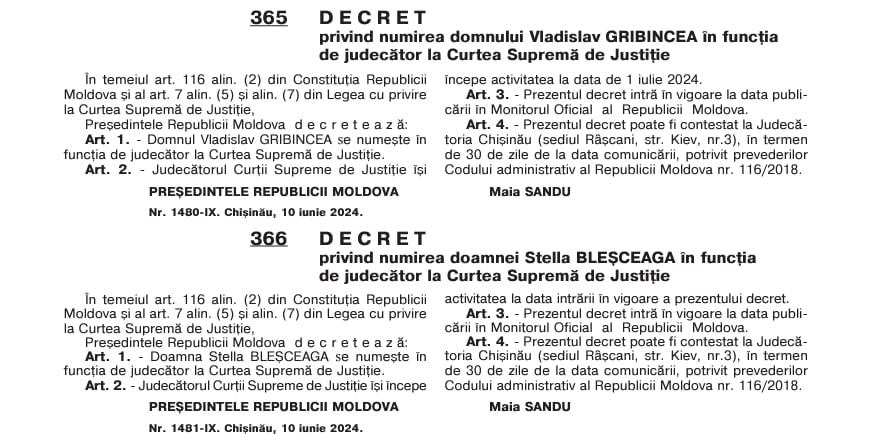 Vladislav Gribincea și Stella Bleșceaga, judecători la Curtea Supremă de Justiție. Decretul semnat de Maia Sandu, publicat în Monitorul Oficial