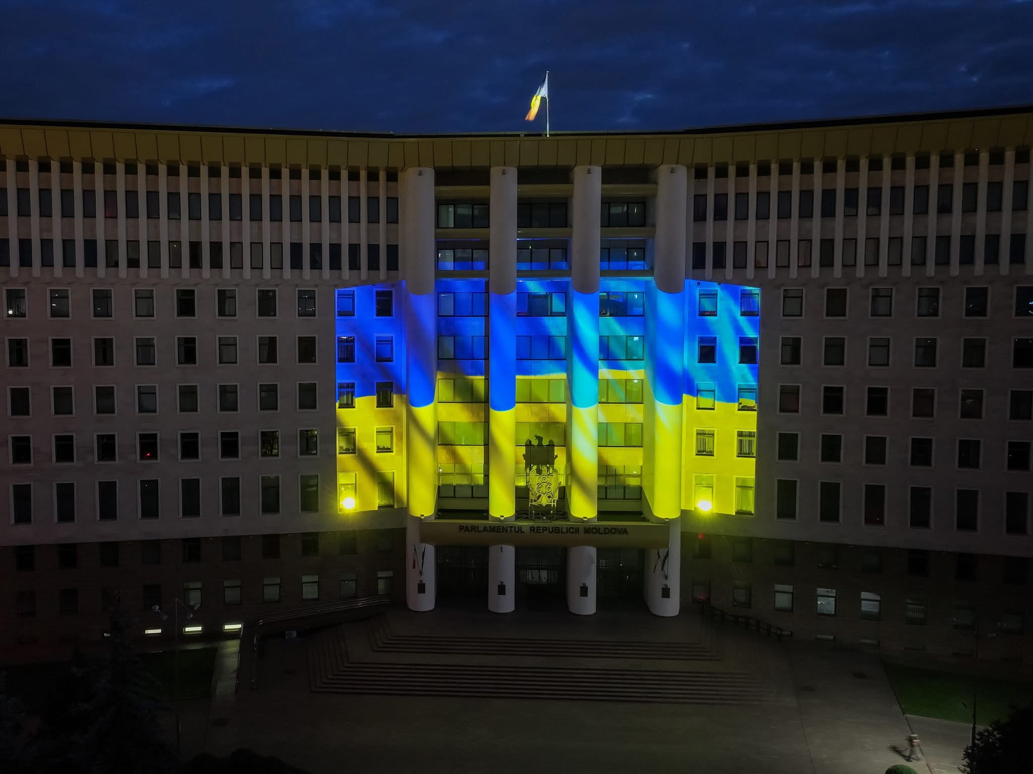 În semn de solidaritate, clădirea Parlamentului Republicii Moldova a fost iluminată, în ajunul sărbătorii, în culorile drapelului ucrainean.