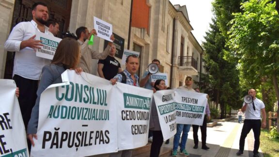 13 iunie 2025 (FOTO) Blocul Alternativa a protestat la Consiliul Audiovizualului: “Libertatea de exprimare există doar în documentele livrate partenerilor europeni”