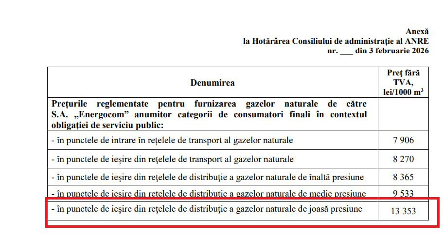 Agenția Națională pentru Reglementare în Energetică (ANRE) propune un tarif mai mic la gazele naturale decât cel solicitat anterior de compania Energocom. Potrivit proiectului de hotărâre, consumatorii casnici din Republica Moldova ar putea achita 13,35 lei/m³ fără TVA, respectiv 14,42–14,43 lei/m³ cu TVA inclus, pentru gazele naturale.