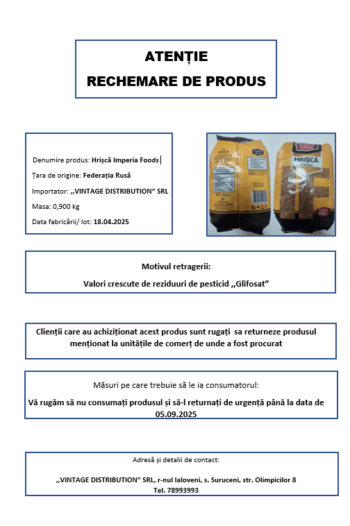 Agenția Națională pentru Siguranța Alimentelor anunță despre retragerea de pe piață a produsului – Hrișca „Imperia Goods”. Măsura a fost luată în urma identificării unor valori crescute de reziduuri de pesticid „Glifosat”.