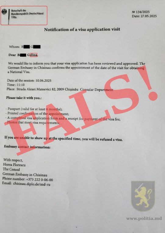 Poliția Republicii Moldova avertizează populația în legătură cu o nouă schemă de înșelăciune în care mai mulți cetățeni au fost păgubiți după ce au achitat sume de bani unei companii necunoscute. Aceasta le promitea programări pentru viză și locuri de muncă în Germania, însă documentele oferite erau false și nu aveau nicio legătură cu Ambasada Germaniei.