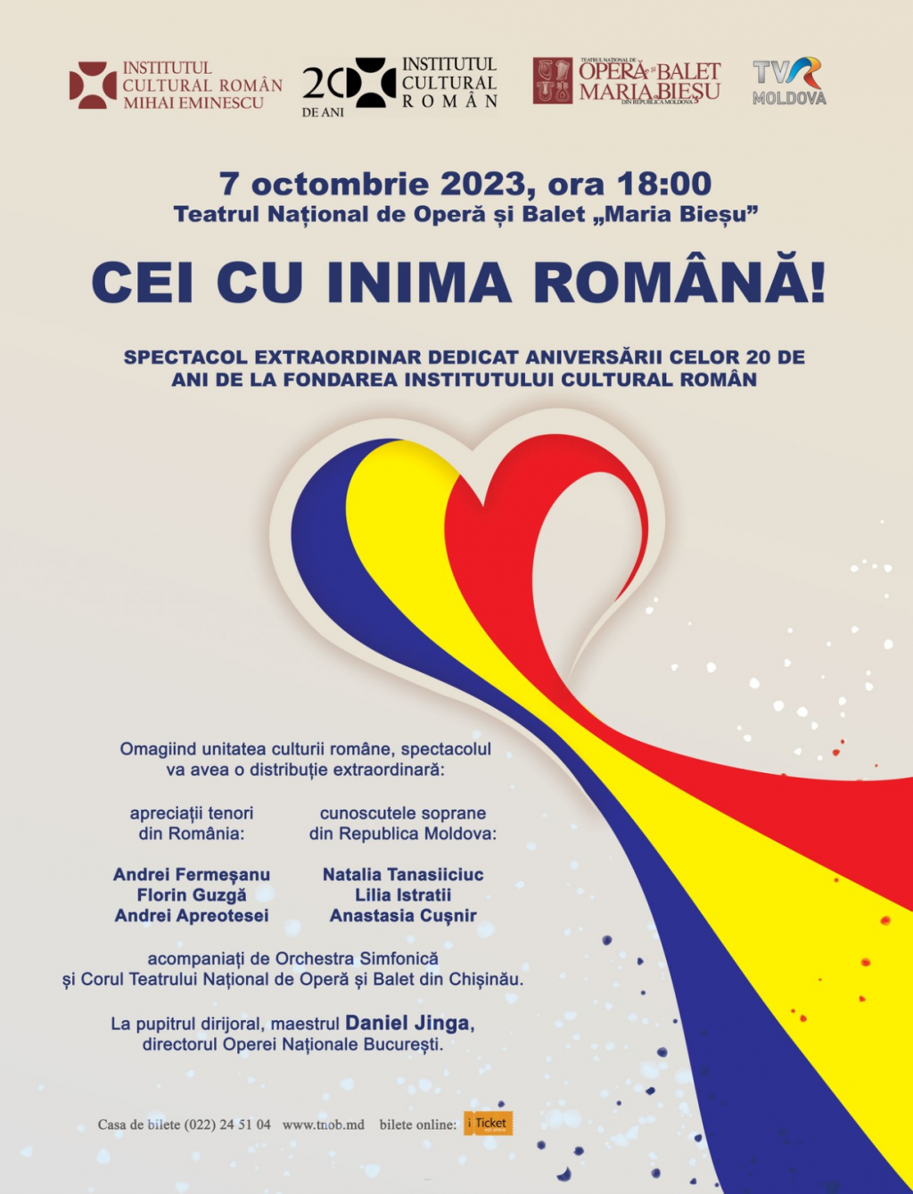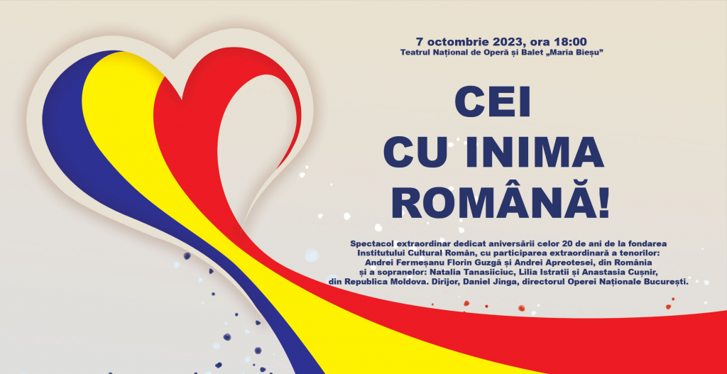 Institutul Cultural Român „Mihai Eminescu” la Chișinău în colaborare cu Teatrul Național de Operă și Balet „Maria Bieșu” și TVR Moldova organizează un spectacol extraordinar dedicat aniversării celor 20 de ani de la fondarea Institutului Cultural Român și celor 13 ani de la înființarea Institutului Cultural Român „Mihai Eminescu” la Chișinău.