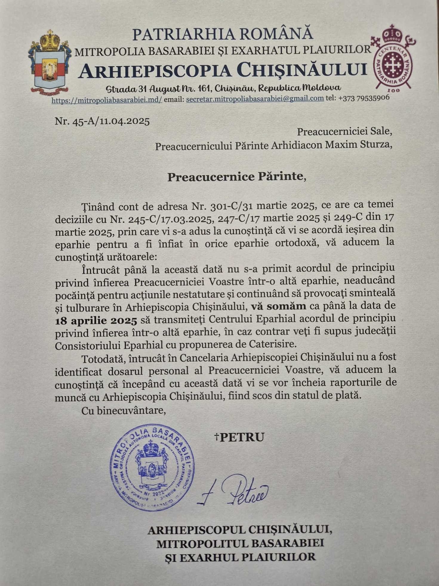 Mitropolia Basarabiei a transmis sâmbătă, 19 aprilie, un comunicat oficial prin care califică drept „nevalidă și profund vătămătoare pentru ordinea bisericească” așa-numita „reprimire” a diaconului Maxim Sturza în rândul clerului Mitropoliei Moldovei, subordonată Patriarhiei Moscovei.